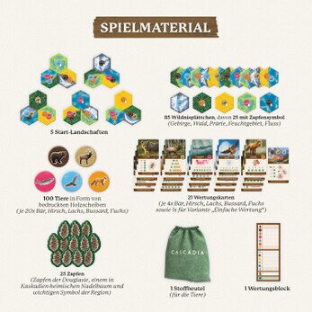 Willkommen in Cascadia! Hier, im Nordwesten Amerikas, fühlen Tiere sich wohl: Bussarde kreisen in den Lüften, Bären treten paarweise auf, Hirsche machen sich auf die Wanderung und Füchse streifen umher. Und natürlich dürfen auch die Lachse nicht fehlen. Auf ihren Flusswanderungen durchqueren sie weite Landschaften. 1–4 Spielerinnen und Spieler ab 10 Jahren haben alle Wildtiere im Blick und legen in ihrem Spielzug ein neues Wildnisplättchen an ihre Landschaft an. Die unterschiedlichen Wertungskarten geben vor, wie die Tiere angesiedelt werden sollten. Bonuspunkte gibt es für die größten zusammenhängenden Gebiete in jeder Landschaftsart. Dank des leichten Zugangs gleich das Spiel beginnen und ein neues Zuhause für viele Tiere schaffen –mit etwas Glück und der richtigen Taktik. Ein abwechslungsreiches Familienspiel und passendes Geschenk für Fans von Legespielen sowie Naturfreundinnen und Naturfreunden – mit Solo-Spielvariante auch alleine spielbar.